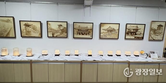 갤러리 벽면에는 수강생들이 직접 완성한 인두화 그림이 전시되어 있으며, 쇼케이스에는 전통 한지를 활용해 만든 미니조명 위에 인두로 그림과 글을 새긴 한지조명 작품이 함께 전시되어 눈길을 끌고 있다.