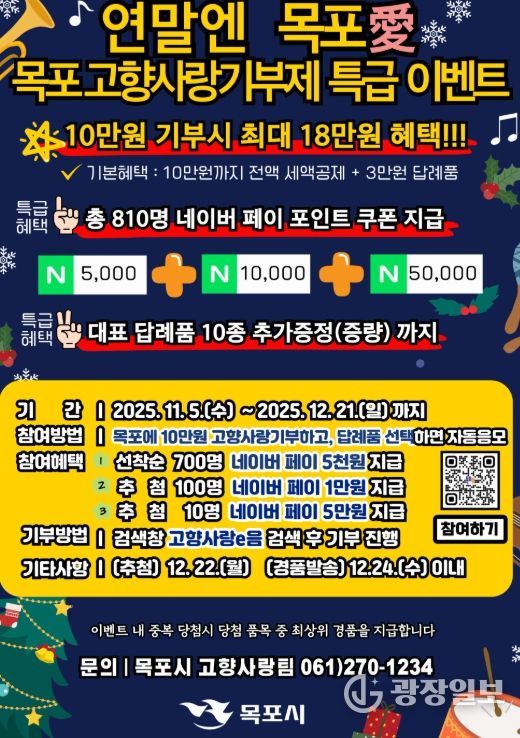 광장일보 주재영 기자 | 목포시는 본격적인 연말정산 준비 시기를 맞아 올해 마지막으로 ‘연말엔 목포愛~ 고향사랑기부제 특급 이벤트’를 진행한다고 밝혔다.
