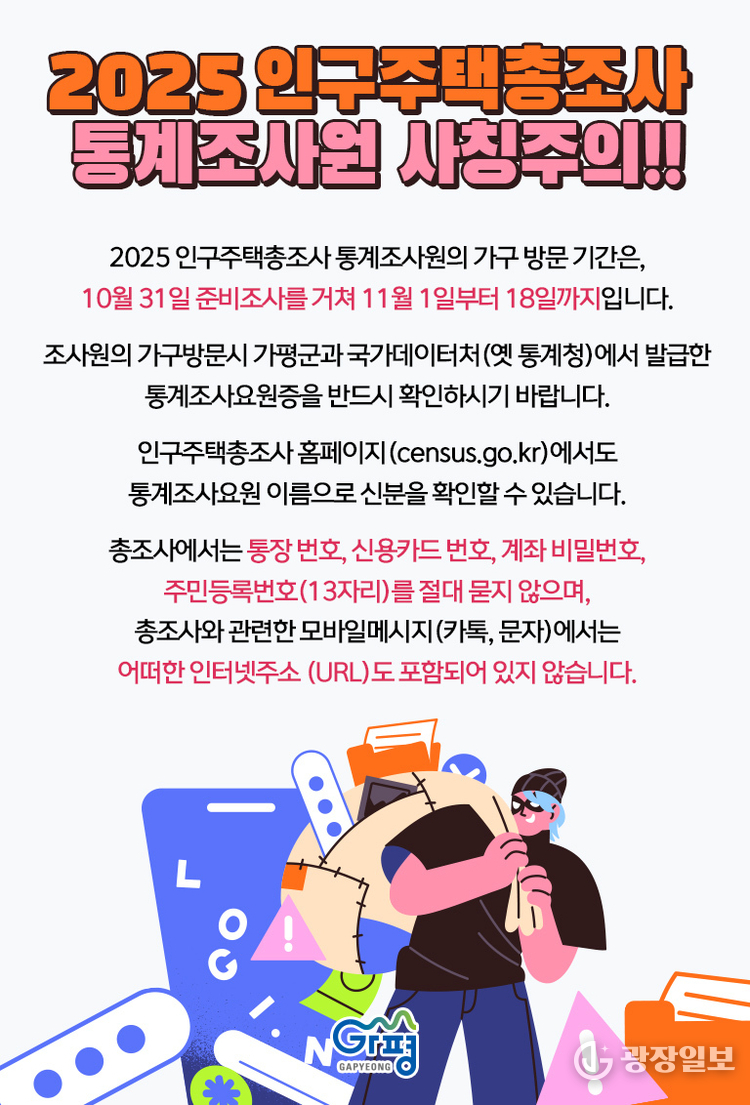 가평군= 주재영 기자 |가평군은 국가데이터처(옛 통계청)가 주관하는 ‘2025 인구주택총조사’가 진행됨에 따라, 이를 악용한 보이스피싱 및 개인정보 유출 피해에 대한 각별한 주의를 당부했다.