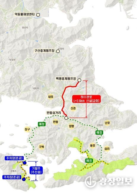 광장일보 주재영 기자 | 창원특례시는 금회 사업비 36억 원으로 구산면 심리 일원에 하수관로(L=2.6km) 설치하여 관광단지 및 인근 마을에서 발생하는 오수를 덕동물재생센터에서 처리하도록 하는 구산해양관광단지 공공기반시설(하수도) 설치사업을 추진할 계획이다.