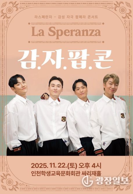 광장일보 주재영 기자 | 인천광역시교육청학생교육문화회관은 11월 22일 오후 4시, 대공연장 싸리재홀에서 대한민국 최초의 팝페라팀 라스페란자의 공연 ‘라스페란자 감자팝콘’을 개최한다.
