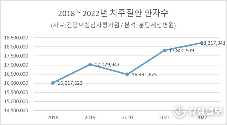건강보험심사평가원의 치주 질환자 수를 분석한 자료에 따르면 2018년 1,600만명이었던 치주 질환자수가 2022년에는 1,800만명으로 약14% 증가한 것으로 나타났다.