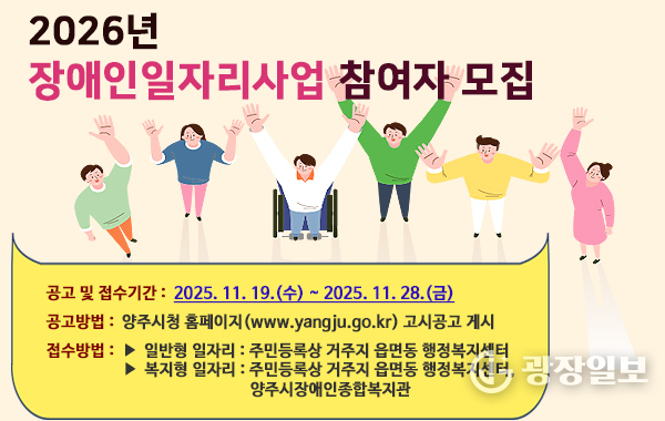 양주시=주재영 기자 |양주시는 오는 11월 28일(금) 까지 2026년 장애인일자리사업 참여자를 모집한다고 밝혔다. 올해 모집 인원은 전일제 30명, 시간제 15명, 복지형 101명으로 지난해보다 13명 증가한 총 146명이다.