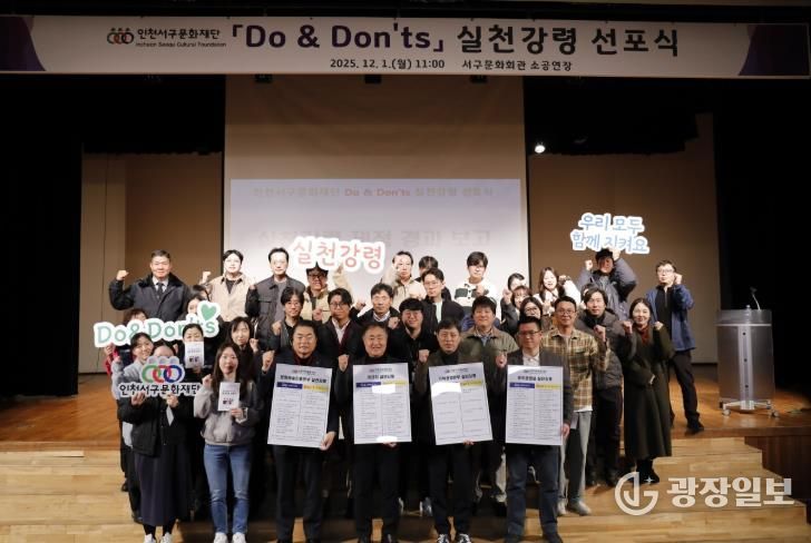 광장일보 주재영 기자 | 인천서구문화재단은 지난 1일 서구문화회관 소공연장에서 ‘Do & Don’ts 실천강령 선포식’을 개최하고, 전 직원이 함께 참여하는 청렴·인권 조직문화 정착 의지를 공식적으로 밝혔다.
