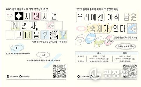 광장일보 주재영 기자 | 인천광역시와 (재)인천문화재단은 인천 지역에서 활동하는 문화예술교육 매개자의 전문성 향상과 지속가능한 활동 기반을 위해 '2025 문화예술교육 매개자 역량강화 과정'을 오는 12월 8일부터 17일까지 운영한다.