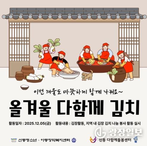 이번 활동은 2025년 12월 5일 신동 다함께돌봄센터·신동청소년아동장학복지센터 공동으로 주관하여 진행되며, 김장 전달식은 2025년 12월 9일 9가구에 전달될 예정이다.