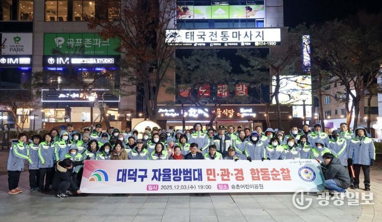 ![최충규 대덕구청장(사진 첫 번째 줄 왼쪽 여덟 번째)과 대덕구 자율방범대원 및 관계자들이 3일 송촌어린이공원에서 민·관·경 합동 야간 합동 순찰을 진행하기에 앞서 기념 촬영을 하고 있다.]](/data/photos/portnews/202512/20251204100301-74060.jpg)