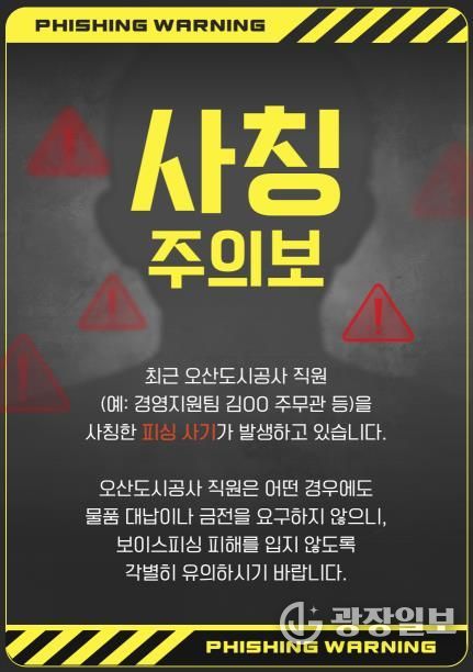 광장일보 나병석 기자 | 오산도시공사는 최근 공사 직원을 사칭해 고액 물품 납품이나 계약을 요구하는 사례가 확인됨에 따라 지역 기업과 시민들에게 각별한 주의를 당부했다고 4일 밝혔다.