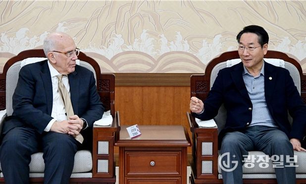 광장일보 주재영 기자 | 유정복 인천시장은 12월 3일 오후 인천시청 접견실에서 세계 최고 수준의 의과·바이오 연구 중심 대학인 존스홉킨스대의 조나단 슈넥(Jonathan schneck) 의과대학 교수(왼쪽) 일행을 접견했다.