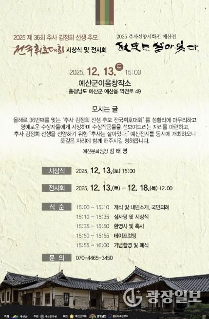 광장일보 주재영 기자 | 예산문화원은 지난 10월 11일 개최된 ‘제36회 추사김정희선생 추모 전국휘호대회’ 시상식을 오는 12월 13일 예산군 이음창작소에서 진행한다고 밝혔다.