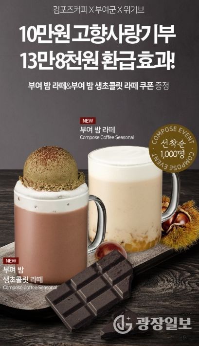 광장일보 주재영 기자 | 부여군은 연말 고향사랑기부제 기부자 확보 및 부여 특산물인 밤을 활용하여 출시한 컴포즈커피 신메뉴인 ‘부여 밤 라테와 부여 밤 생초콜릿 라테’를 홍보하기 위하여 특별 이벤트를 기획했다.