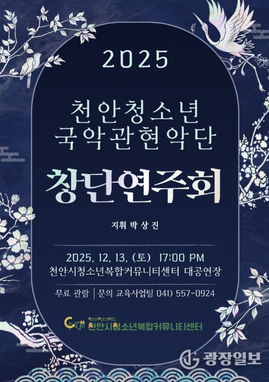 광장일보 주재영 기자 | (재)천안시청소년재단 천안시청소년복합커뮤니티센터는 오는 13일 센터 대공연장에서 ‘천안청소년국악관현악단 1기 창단연주회’를 개최한다고 밝혔다.