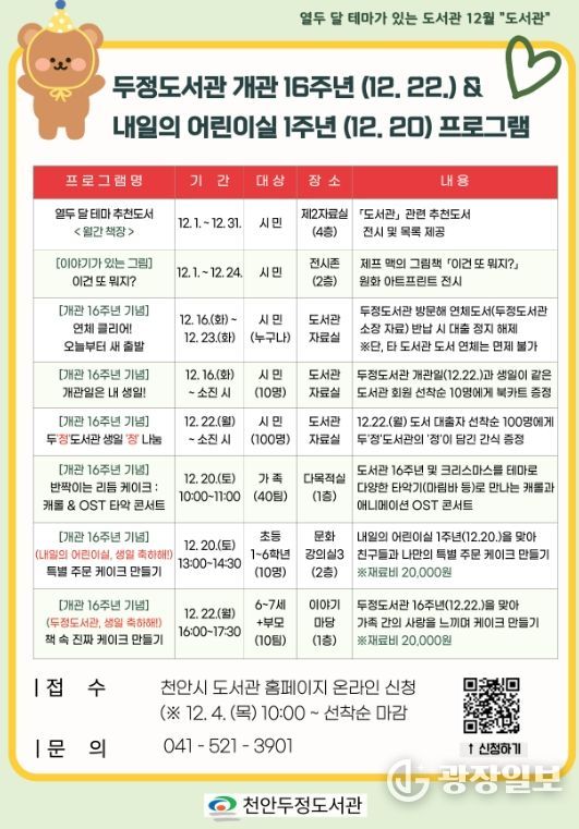 광장일보 주재영 기자 | 천안시 두정도서관은 12월 ‘도서관’을 테마로 도서관을 운영한다고 5일 밝혔다.