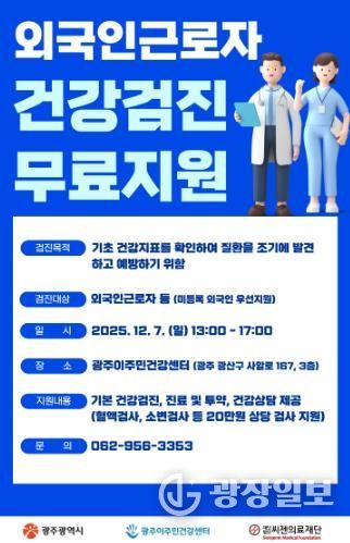 광장일보 주재영 기자 | 광주광역시는 오는 7일 오후 1시부터 5시까지 광주이주민건강센터에서 외국인근로자 등을 대상으로 무료 건강검진을 실시한다.