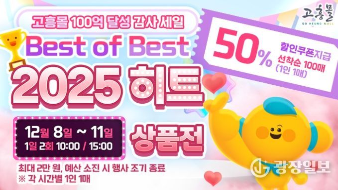 광장일보 주재영 기자 | 고흥군은 직영 온라인 농수축특산물 쇼핑몰 ‘고흥몰’이 누적 매출 100억 원 돌파를 기념해 오는 1월 8일부터 11일까지 ‘100억 달성 감사 세일–2025 Best of Best’ 기획전을 진행한다고 밝혔다.