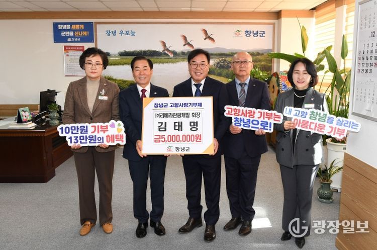 광장일보 주재영 기자 | 창녕군은 5일 김태명 ㈜리베라관광개발 회장이 고향사랑기부금 500만 원을 기탁했다고 밝혔다.