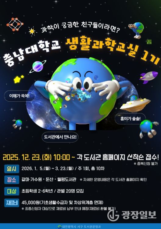 광장일보 이현나 기자 | 대전 서구 관내 4개 공공도서관(갈마·가수원·둔산·월평도서관)은 지역 어린이들의 과학적 사고력과 창의력을 키우기 위한 2026년 ‘충남대학교 생활과학교실’ 1기를 운영한다.