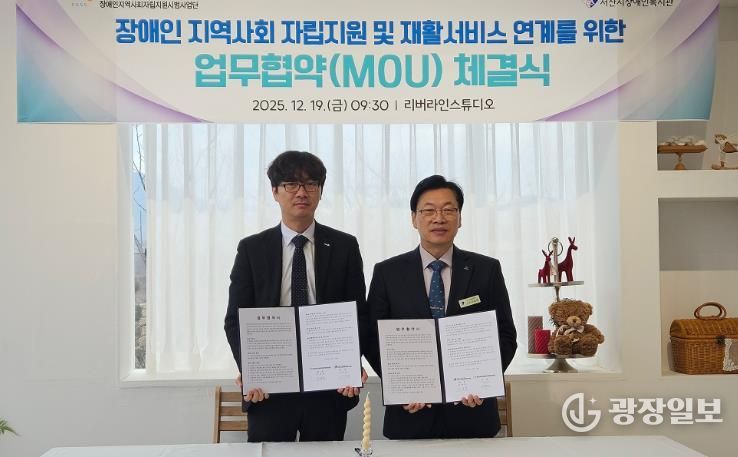광장일보 주재영 기자 | 서산시장애인지역사회자립지원시범사업단과 서산시장애인복지관은 2025년 12월 19일, 서산시에 거주하는 장애인의 안정적인 지역사회 정착과 복지 향상을 위해 업무협약(MOU)을 체결했다.