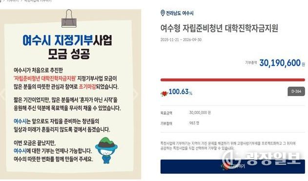 시 관계자는 “여수 고향사랑기부제에 적극 참여해 준 모든 기부자분들께 깊이 감사드린다”라며, “세제 혜택이 더욱 확대되는 만큼, 앞으로도 많은 분들이 여수시와 소중한 인연을 맺고 지역 발전에 동참할 수 있도록 매력적인 답례품과 기부자가 공감하는 기금 사업을 지속적으로 발굴해나가겠다”라고 밝혔다.