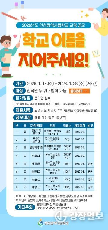 광장일보 주재영 기자 | 인천광역시교육청은 1월 14일부터 28일까지 2주간 신설학교 8교의 명칭을 공모한다.