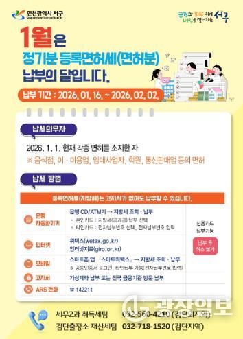 광장일보 주재영 기자 | 인천 서구는 2026년도 1월 정기분 등록면허세 8만5천여 건, 28억9천4백만 원을 부과하고 올해 2월 2일까지 납부를 당부하는 등 적극적인 홍보에 나섰다.