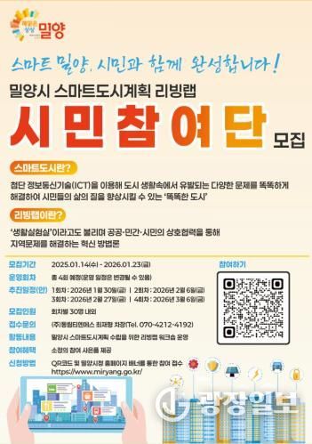 광장일보 주재영 기자 | 경남 밀양시는 지역 내 다양한 도시문제 해결을 위한 ‘밀양시 스마트도시 리빙랩 시민참여단’을 1월 23일까지 모집한다고 밝혔다.
