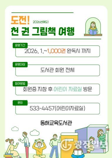 광장일보 이현나 기자 | 동해교육도서관(관장 안은희)은 지역주민의 정서적 공감능력과 상상력 증진을 위해 독서 프로그램 ‘도전! 천 권 그림책 여행’을 운영한다고 밝혔다.