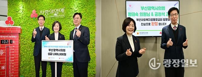 광장일보 주재영 기자 | 부산광역시의회는 법제처가 주관하는‘우수 자치입법 활동 지방정부 평가’에서 광역 부문 우수 기관으로 선정되어 받은 포상금 100만 원 전액을 13일 오전 부산사회복지공동모금회에 기부하고 ‘희망 2026 나눔캠페인’에 동참했다.