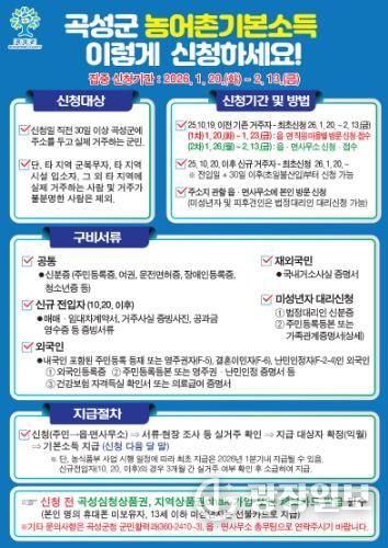 집중 신청 기간은 2026년 1월 20일부터 2월 13일까지이며, 신청 초기인 1월 20일부터 1월 23일까지는 읍 · 면 직원이 마을을 직접 찾아가는 현장 접수를 통해 고령자와 이동이 불편한 주민들의 편의를 높일 계획이다.