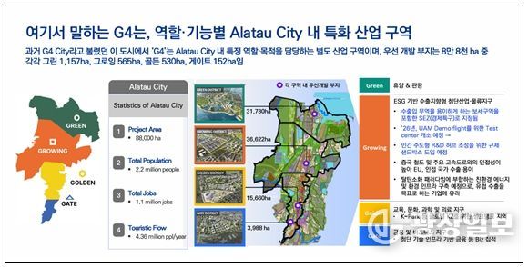 알라타우 시티는 카자흐스탄 알마티 북측에 조성 중인 대규모 신도시로, 금융·비즈니스, 의료·교육, 산업·물류, 관광·레저 등 기능별로 구분된 4개 특화 지구(G4)를 중심으로 개발이 추진되고 있다.