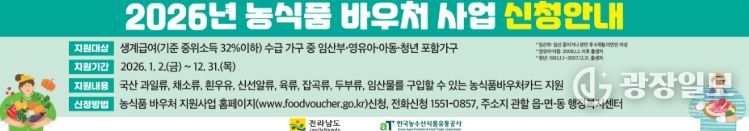 박상미 전남도 농식품유통과장은 “농식품 바우처 사업을 통해 취약계층이 신선한 농식품을 보다 쉽게 접하고 지역 농산물 소비 활성화에도 기여하도록 지원하겠다”며 “특히 올해부터 청년층까지 지원 대상을 확대해 더 많은 가구가 혜택을 누리도록 적극 홍보하겠다”고 말했다.