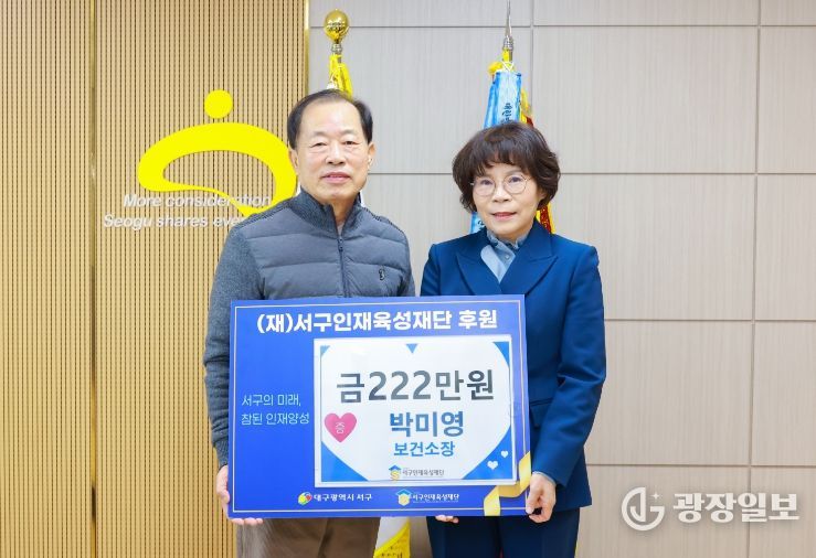 광장일보 주재영 기자 | 대구 서구청은 보건소 박미영 보건소장이 퇴임을 앞두고 지역 인재 육성을 위해 서구 인재육성재단에 222만 원을 기탁했다고 밝혔다.