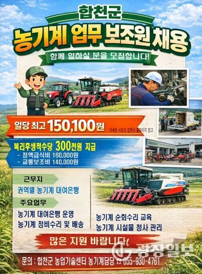 광장일보 주재영 기자 | 합천군은 농기계대여은행 운영체계를 강화하고 농업인 영농 편의를 높이기 위해 2026년 농기계 업무보조원 기간제근로자 9명을 채용한다고 14일 밝혔다.