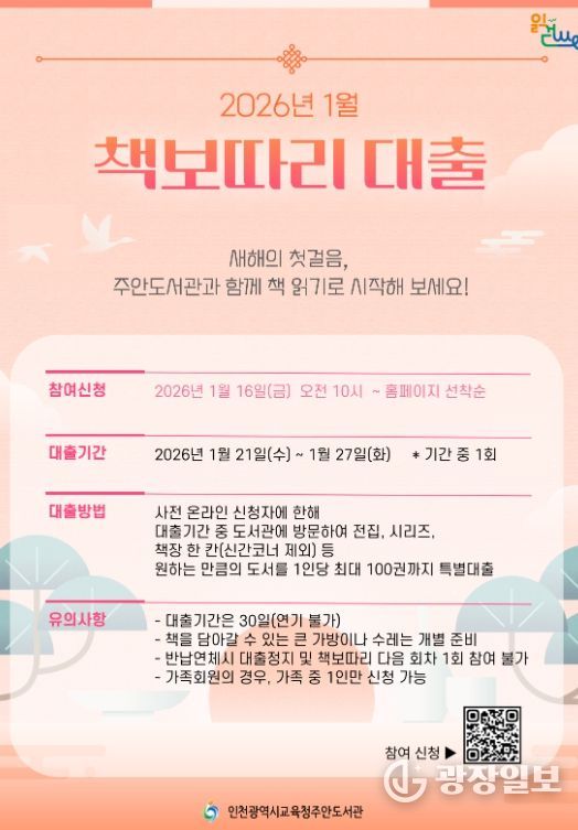 광장일보 주재영 기자 | 인천광역시교육청주안도서관은 지역주민의 독서문화 정착과 대출 활성화를 위하여 2025년에 이어 올해도 '책 보따리 대출'을 실시한다고 14일 밝혔다.