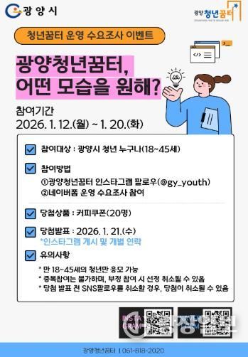 광장일보 주재영 기자 | 광양청년꿈터가 1월 12일부터 20일까지 ‘광양청년꿈터, 어떤 모습을 원해?’를 주제로 2026년 청년꿈터 운영을 위한 프로그램 수요조사 이벤트를 진행한다.