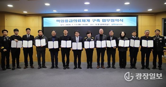 광장일보 주재영 기자 | 전북특별자치도소방본부는 응급환자 수용 지연을 최소화하고 중증응급환자가 신속하고 적정한 치료를 받을 수 있도록, 전북특별자치도 복지여성보건국 및 도내 권역·지역응급의료센터 10곳과 '2026년 책임응급의료체계 구축을 위한 업무협약'을 체결했다.