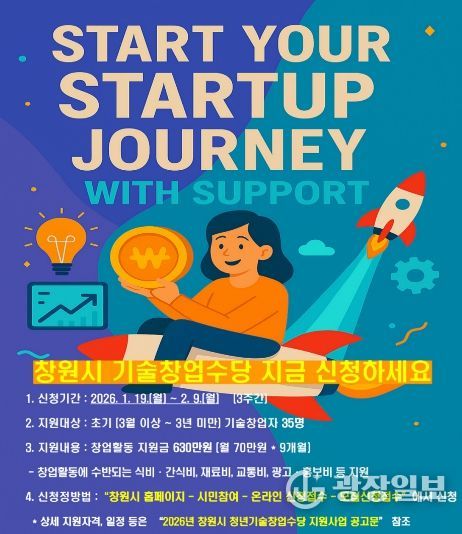 광장일보 주재영 기자 | 창원특례시는 1월 19일부터 2월 9일까지 ‘2026년 청년기술창업수당 지원사업’ 참여자 35명을 모집한다고 밝혔다.