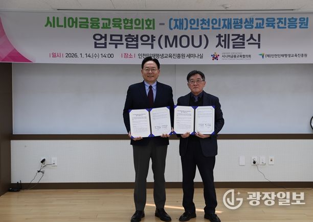 광장일보 주재영 기자 | 인천인재평생교육진흥원과 시니어금융교육협의회은 14일 인천 시민의 평생교육 발전과 중·장년층 및 고령층의 안정적인 금융생활 지원을 위해 업무협약을 실시했다.