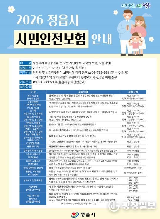 광장일보 주재영 기자 | 정읍시가 각종 재난과 일상 속 사고로부터 시민들을 보호하기 위해 2026년 시민안전보험의 보장 범위를 대폭 강화했다.