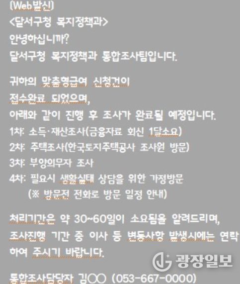 광장일보 주재영 기자 | 대구 달서구는 맞춤형 복지급여(생계·의료·주거·교육) 신청인을 대상으로 조사 진행 상황을 안내하는 ‘알림톡 서비스’를 2026년에도 확대 시행한다.