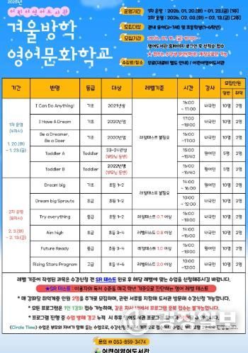 1차는 오는 20일부터 23일까지 3~7세 대상 강좌 5개, 2차는 2월 3일부터 13일까지 초등학생 1~6학년을 대상으로 6개 강좌가 운영된다.
