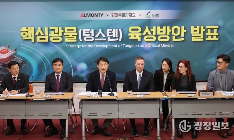 광장일보 이현나 기자 | 김진태 강원특별자치도지사는 1월 15일, ㈜알몬티 인더스트리 최고운영책임자(COO)인 스티븐 알렌(Steven Allen), 최명서 영월군수 등과 함께 영월 상동 텅스텐 광산을 중심으로 한 핵심광물(텅스텐) 육성 방안을 발표했다.