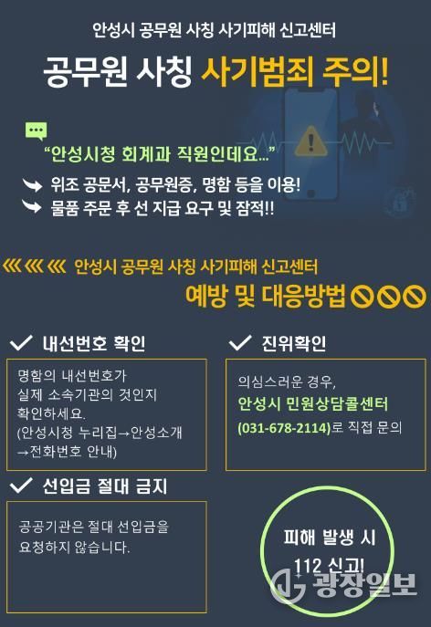 안성시는 최근 소상공인을 대상으로 한 공무원 사칭 사기 행위가 기승을 부림에 따라, 민원상담콜센터에 ‘공무원 사칭 사기피해 신고센터’를 설치하고 본격 대응에 나섰다고 밝혔다.
