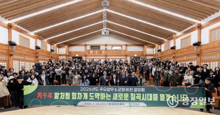 광장일보 주재영 기자 | 칠곡군은 지난 14일 향사아트센터에서 직원 200여 명이 참석한 가운데 ‘2026년도 주요업무 · 군정 비전 공유회’를 개최하여 부서별 비전과 핵심사업을 공유하고 소통하는 시간을 가졌다.