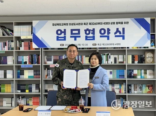 광장일보 주재영 기자 | 경상북도교육청 의성도서관은 1월 15일 육군 제3260부대 4대대, 의성군 가족센터와 각각 지역 독서문화 활성화를 위한 업무협약식을 체결했다고 밝혔다.