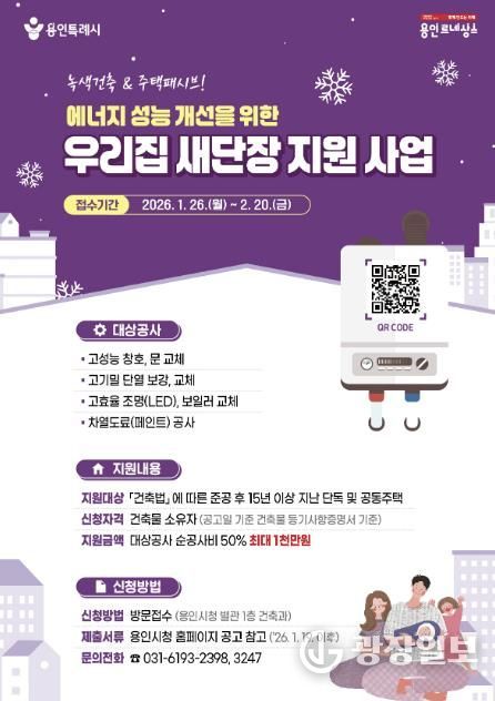 광장일보 주재영 기자 | 용인특례시가 오는 26일부터 2월 20일까지 노후주택 에너지 효율 개선 지원 사업인 ‘우리집 새단장 지원사업’ 신청을 받는다고 16일 밝혔다.