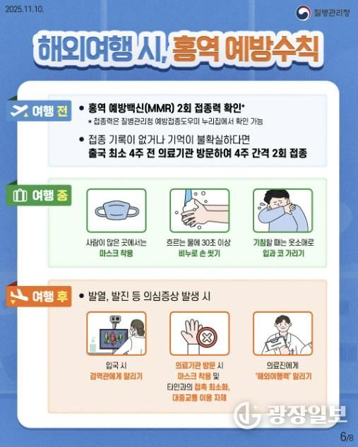 또한, 여행 중에는 손 씻기와 마스크 착용 등 개인위생을 철저히 하고, 여행 후 3주 이내 발열, 발진 등 홍역 의심 증상이 나타나면 반드시 마스크 착용 등 개인위생을 지키고 가까운 의료기관을 방문해야 하며, 진료 시에는 최근 해외여행 이력을 반드시 알려야 한다.
