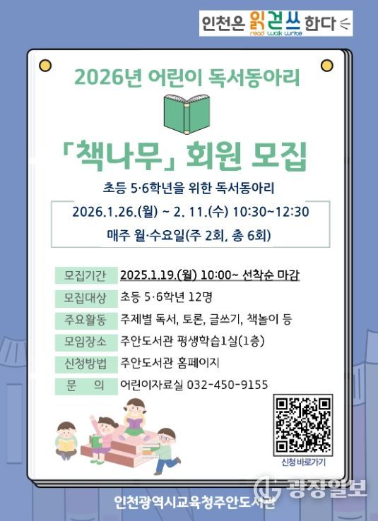 광장일보 주재영 기자 | 인천광역시교육청주안도서관은 예비 초등 5·6학년 학생을 대상으로 하는 독서동아리 '책나무' 회원을 모집한다.
