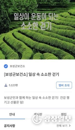 광장일보 주재영 기자 | 보성군은 2026년 한 해 동안 군민 누구나 참여할 수 있는 모바일 앱 활용 비대면 건강 증진 프로그램인 ‘소소한 걷기 챌린지’를 연중 운영한다고 밝혔다.