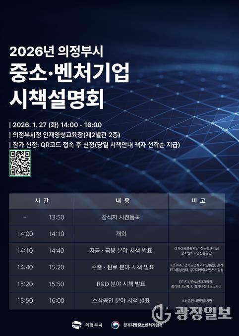 광장일보 주재영 기자 | 의정부시는 1월 27일 시청 인재양성교육장에서 ‘2026년 중소‧벤처기업 시책설명회’를 개최한다.